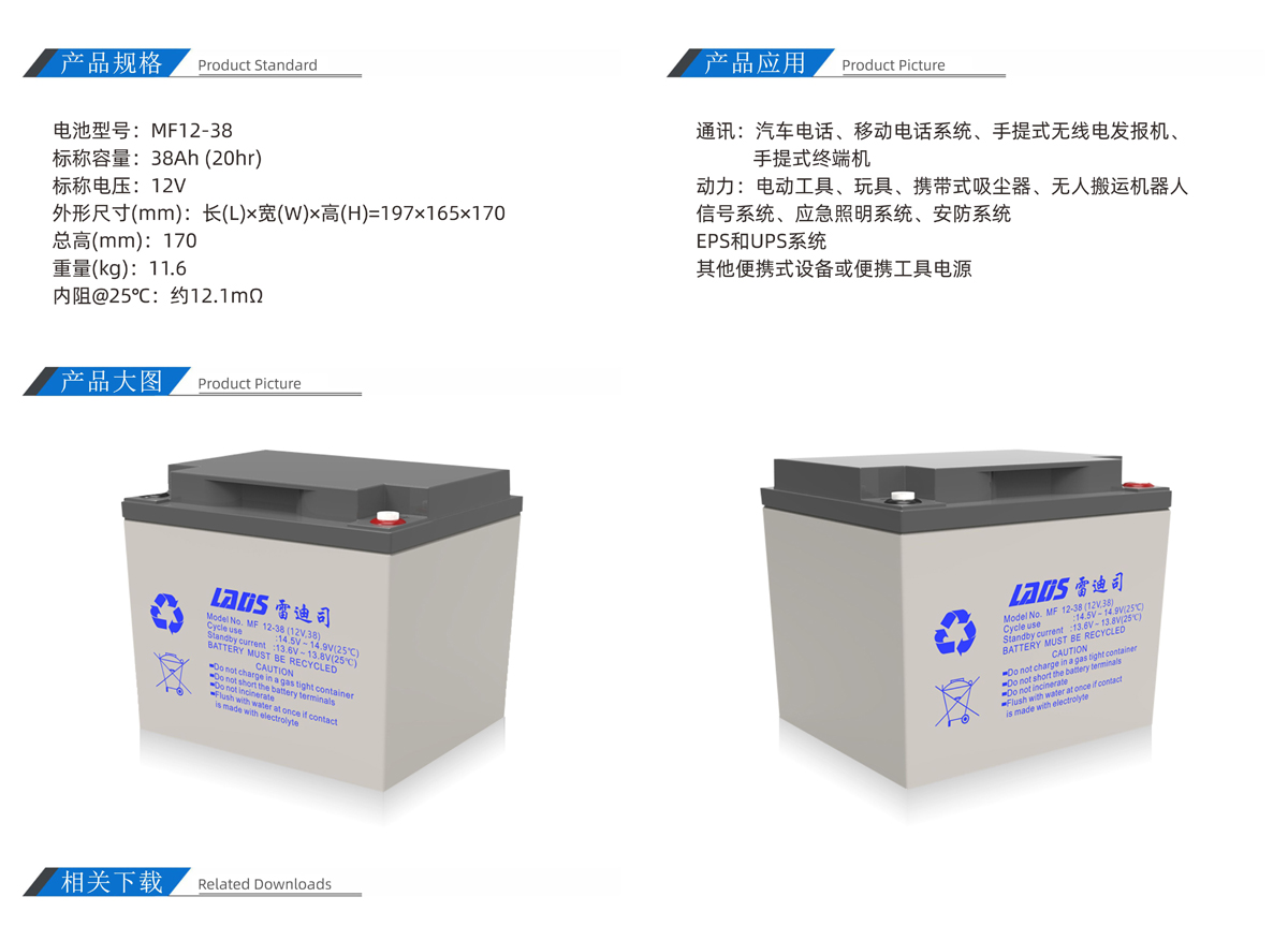 雷迪司MF12-38 12V 38AH閥控密封式鉛酸免維護(hù)蓄電池